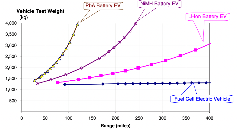 There’s also the comparison between hydrogen and battery-electric vehicles. Here, the main advantage of hydrogen is that increasing range requires only a little bit of increased weight. Fuel cells, are generally bigger than batteries, but at large capacities, are lighter than batteries. So while hydrogen systems are less efficient on a pure energy basis, at heavy and long-range enough vehicles, where lugging the energy storage around is part of the equation, hydrogen may beat out battery-electric in overall efficiency by being lighter. A disadvantage is that hydrogen transport and fueling stations are harder to build out than electric charging stations.