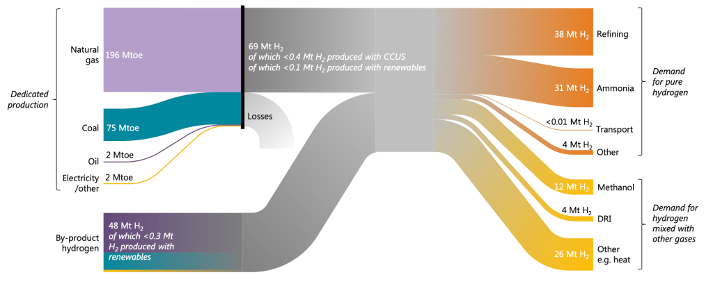 So what’s actually going on in the world? From this figure, we see about 60% comes from natural gas, another 23% from coal, and only a tenth of a percent of hydrogen is produced with renewables. Hydrogen production is not a clean business right now.