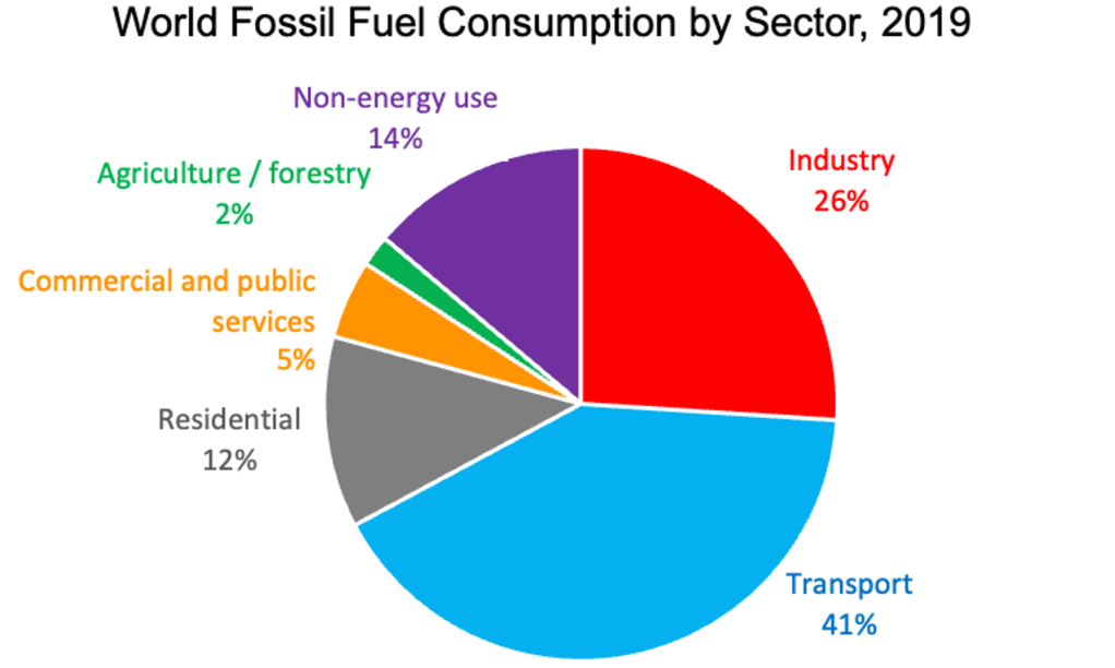- Transport (41%) is cars, trucks, trains, ships, planes, etc., powered mostly by oil.