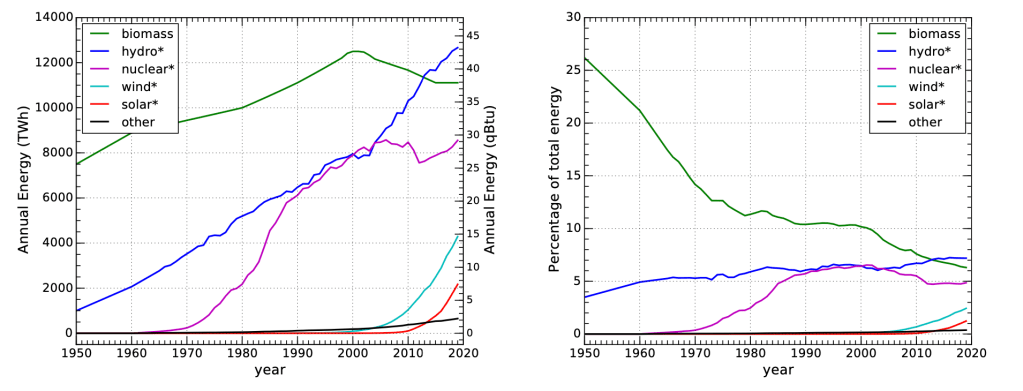 This figure is from the Murphy textbook (data from Smil[4]) and shows both the total annual energy (in yet another unit, terawatt-hours) and percentage of total energy share accounted by various alternative energies. It’s like a zoomed-in version of the tiny slices on the top of the first plot. Here, a key takeaway is that biomass (e.g. wood) is still the second largest source of renewable energy. We also see renewable energy has not grown very much as a percentage of total energy in past decades. Hydro creeps along around 7%, while nuclear is plateauing around 5% and solar and wind have grown to merely 1% and 2% respectively.