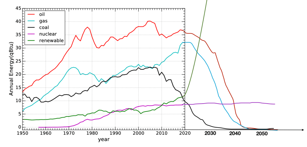 This is a sketch of what if might look like to phase out fossil fuels by ~2045. This is somewhat informed by “net zero” targets, where some governments/corporations have set them as early as 2035. However, many are skeptical of the potential to scale up carbon capture fast enough (or enough at all) to hit net zero targets. Therefore, I’ve drawn this graph to totally phase out fossil fuels by 2045. According to different references and objectives, this may seem like too soon or too late. Notice that the slopes upwards and downwards are all very steep (save nuclear, which I let stagnate). I eyeballed it, trying to also account for the growth of total energy consumption. Observe that renewables would have to skyrocket at a rate faster than we ever grew oil, gas, and coal, to quantities greater than we ever consumed oil, gas, and coal.