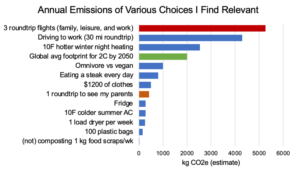 To estimate my avoided emissions, I did a little research and made this graph. As you can see, avoiding the 3 flights I might have otherwise taken is roughly equivalent (by this metric) to the combined annual impact of: not having a fridge, not driving 15 miles to and from work daily, composting all my food scraps, not using a clothes dryer, and not using plastic bags.