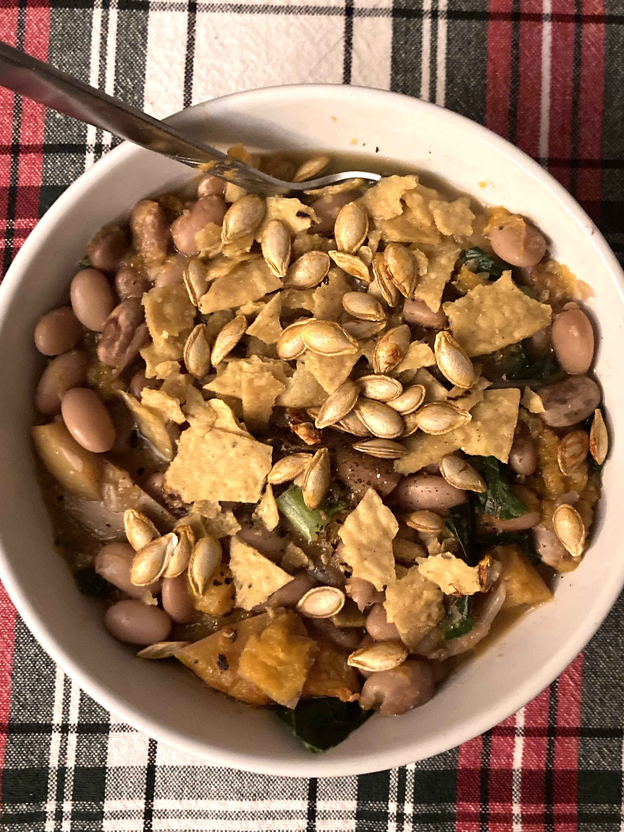 | Dry beans, 2-3 cups dry | Leafy greens, 1-2 bunches | Other vegetables, 1-3 cups | Aromatics | Flavor | Topping |
