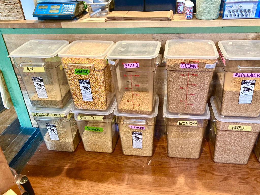 Elemendorf Baking (Cambridge) has regionally grown dry beans and grains, and can fill a container you bring. They stone-mill flour in-house. I love their flour: it’s so much more flavorful than grocery store flour, grown with less pesticides, and uses more of the whole grain. I think it’s well worth the premium.